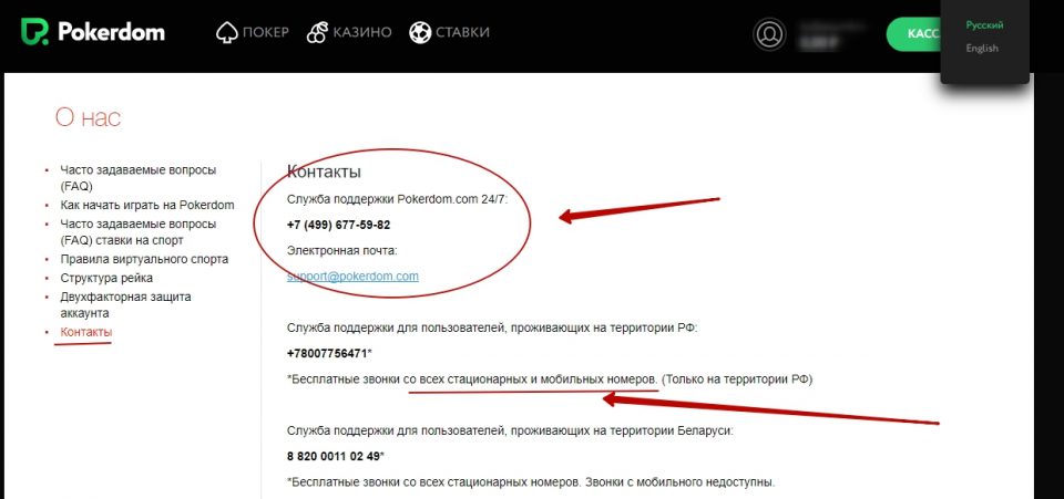 В ПокерДом помощь онлайн можно получить многими способами. Помимо них предоставляется телефонная линия, поэтому игроку есть из чего выбрать. Пользователи оставляют много положительных отзывов о работе технического отдела, отмечая дружелюбность и профессионализм его сотрудников. Обычно проблем со связью не возникает, исключения могут составлять только пиковые часы, когда время отклика несколько увеличивается.